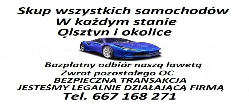 - Kupimy każdy samochód w cenie adekwatnej do stanu pojazdu.Tylko u nas zwrot OC i darmowa laweta.Kasacja ,złomowanie Olsztyn